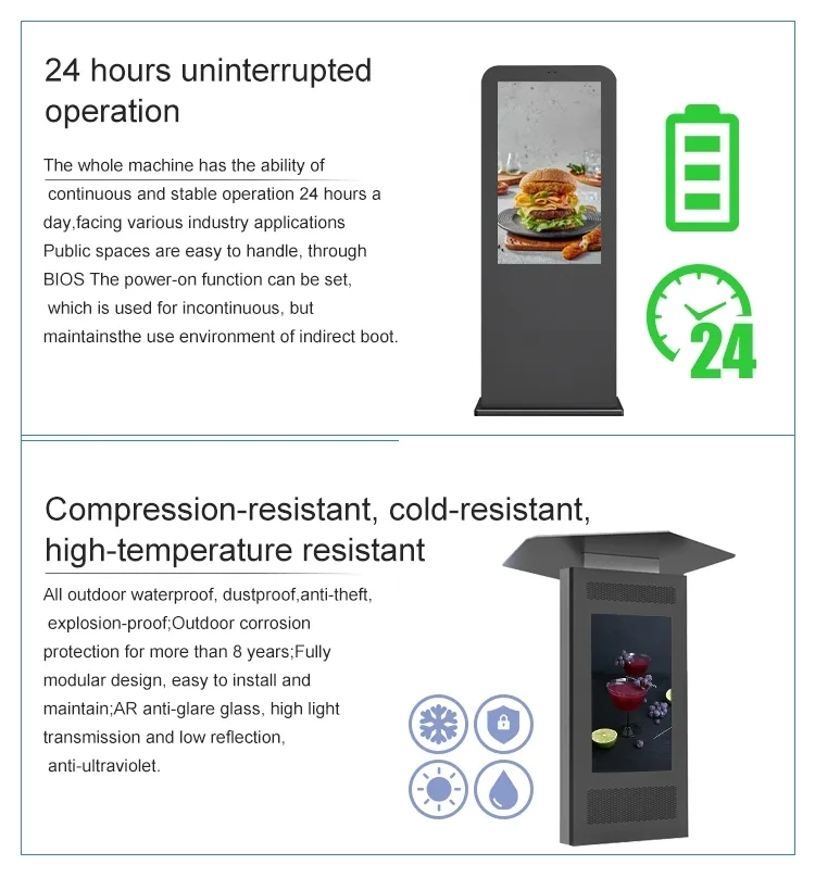 Deliver rich business information and image quality in an outdoor environment with high brightness and picture quality.Keeps viewers focused on business messages with bright, vivid displays that increase brand awareness, customer traffic and revenue.