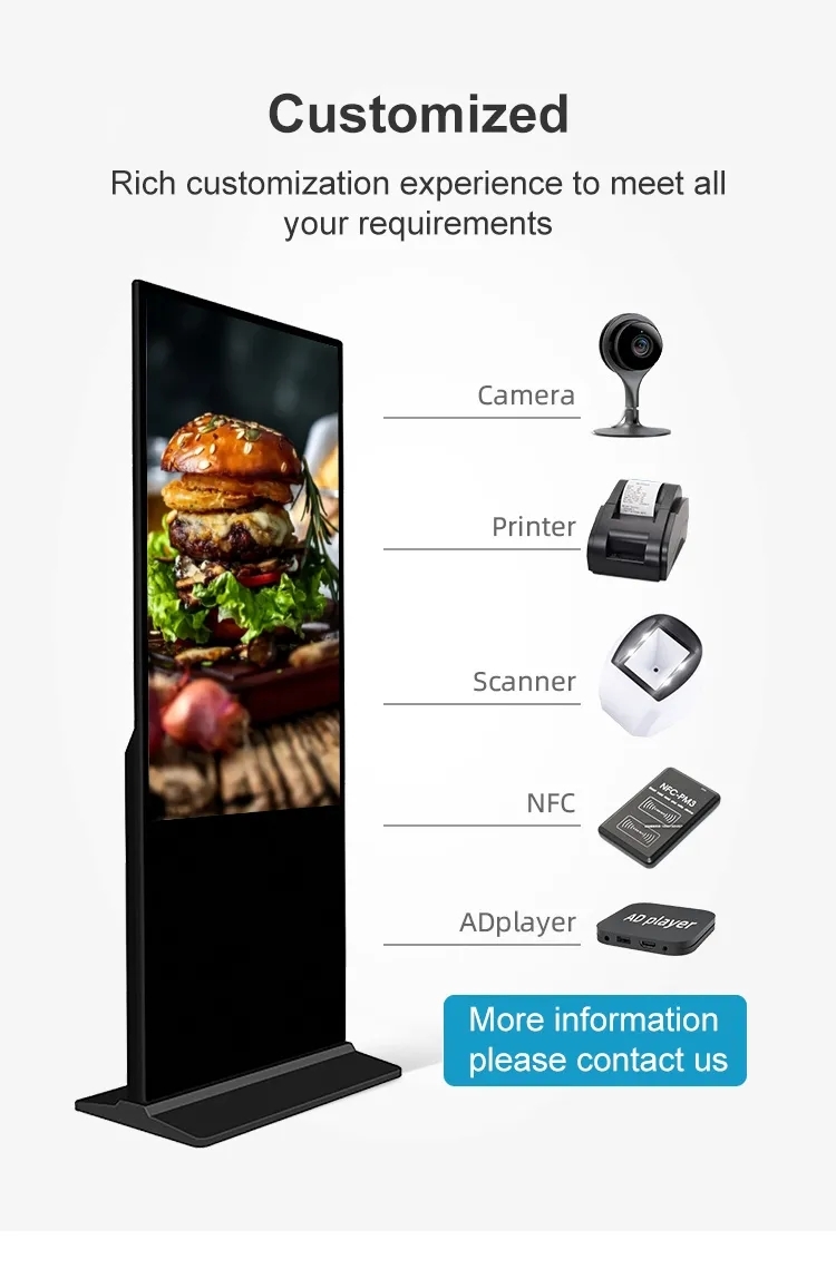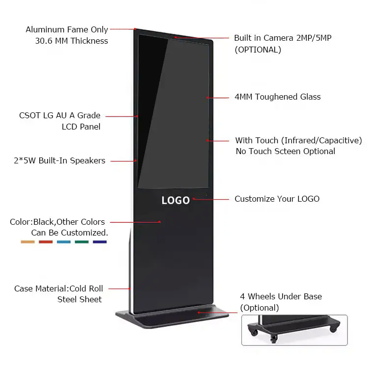 Customized 55 inch Super Slim Floor Standing Digital Signage 4k screen Metal case with 4 wheels