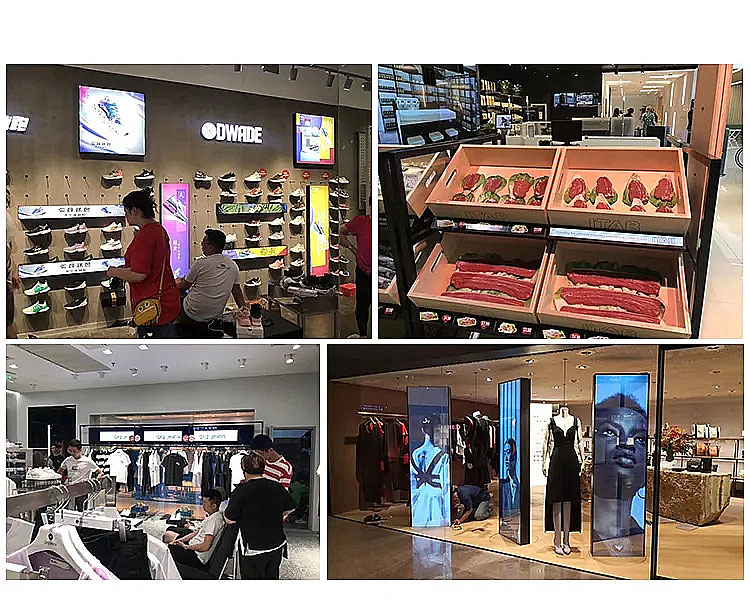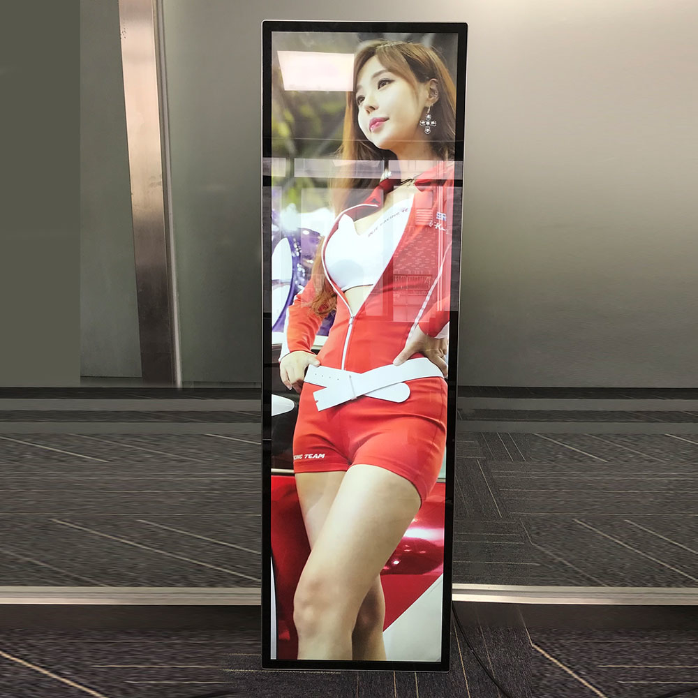 This LCD stretched display is designed for installing in shop window, facing to the outside so people can see advertisements when you pass by, to attract their attention and go into the shop to view products.