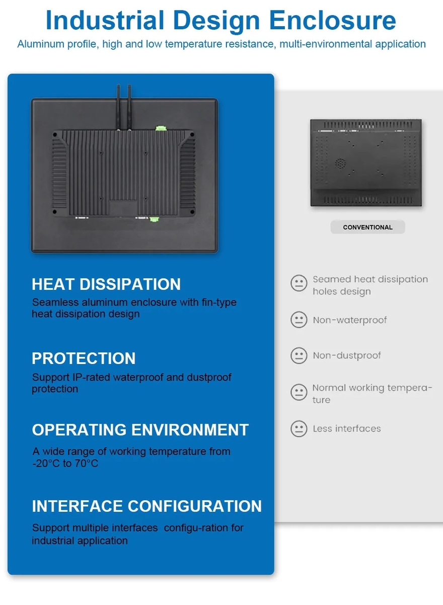 • Front bezel aluminum alloy brushed metal craft, seamless design, front IP65 waterproof and dustproof.