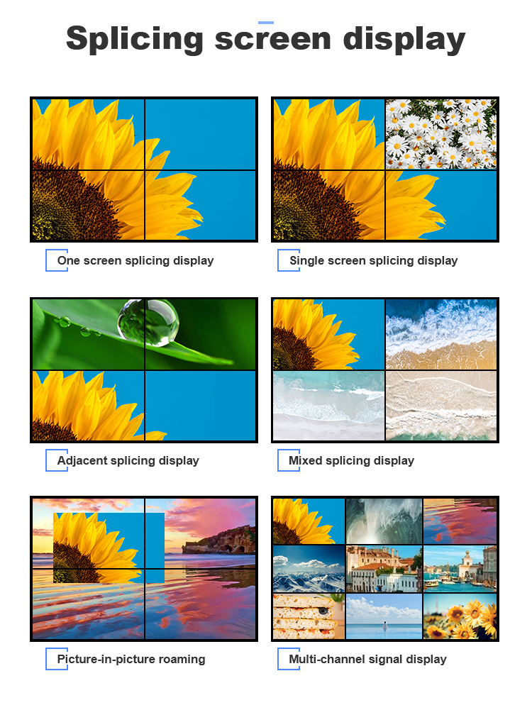 Our company's large screen LCD splicing is specifically for security monitoring, business, entertainment industry to provide high-quality products and solutions, using the most outstanding international Sanxing, LG and other well-known brands of industrial flagship LCD splicing panel, combined with ultra-narrow LCD splicing technology, signal switching technology, image splicing processing technology and other comprehensive applications to form a set of functional diversity, intelligence, advanced and simple operation of the LCD splicing display system, to show customers a high brightness, high definition, non-interference quality LCD splicing large screen.